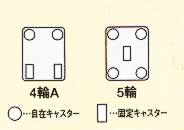 ■キャスターレイアウト![]() ■5輪タイプ(300kg専用) センターの固定キャスターで直進性も確保。 ![]() ■その場で方向転換ができ、狭いスペースでも簡単操作 ![]() ■タイプ