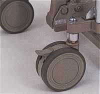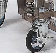 ■特長 ●早揚り機構(自動切替・内蔵) 無負荷(軽負荷)時はテーブル(フォーク)の上昇スピードが2〜3倍になり、作業効率がアップ。 一定の荷重を超えると、通常スピードに自動切替になる安全設計です。 ![]() ●双輪キャスター(標準型) 走行・旋回を同時に止めるストッパーを装備。車輪はエラストマーゴムを採用し、床をキズつけないクリーンでやさしい 材質です。 ![]() ●ゴム車輪(S型) サントカーS型はハードな作業環境に適したゴム車輪を採用。 ![]()